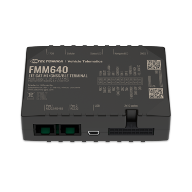 Teltonika FMM640 is PROFESSIONAL worldwide tracker with LTE CAT M1, NB IoT connectivity, that makes this device usable with newest and most cost efficient technologies. FMM640 features like FMS CAN data (J1939), fuel CAN data (J1708), tachograph live data (K-line), remote tachograph file download, various third party RS232 or RS485 devices support and Dual-SIM will maximize your fleet efficiency. Terminal is suitable for applications like international logistics, refrigerated transport, agriculture, construction & mining, security & emergency services and even more.